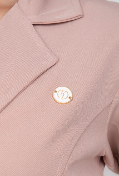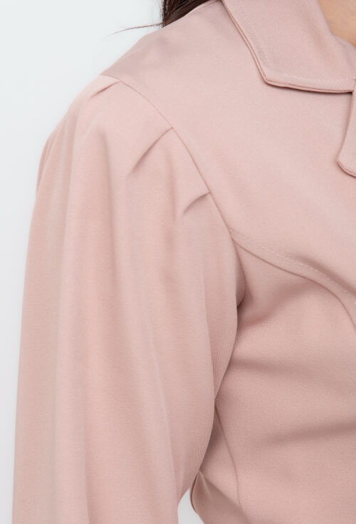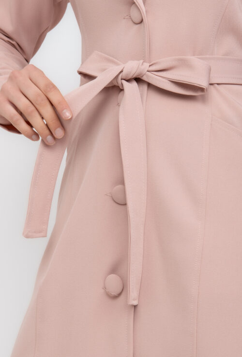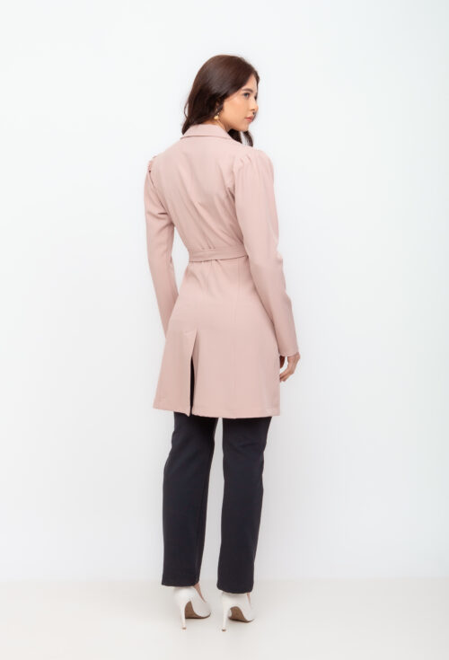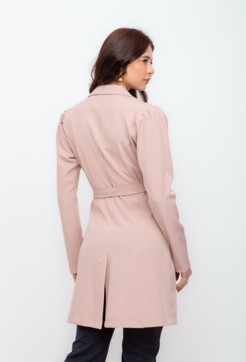 Jaleco Elastic com cinto tem em sua composição 95% poliester e 5% elastano, acinturado com cinto do mesmo tecido e com bolsos na frente. Possui gola tradicional, mangas bufantes e botões forrados.