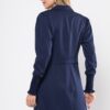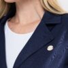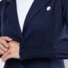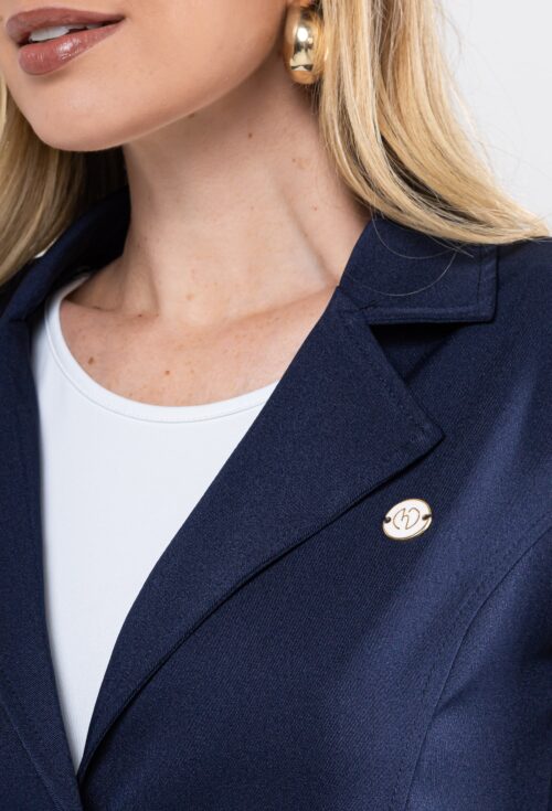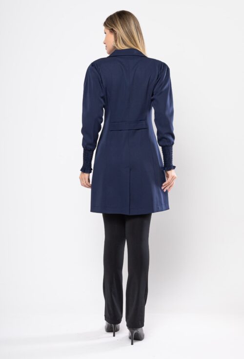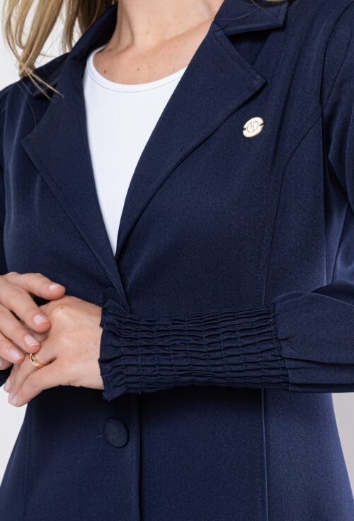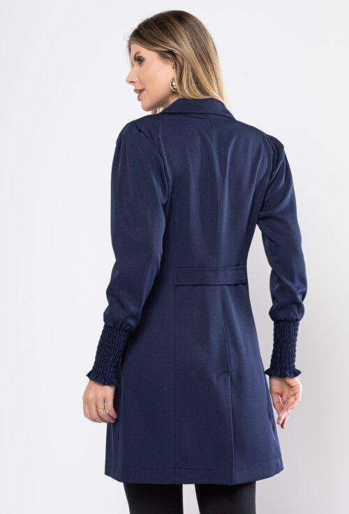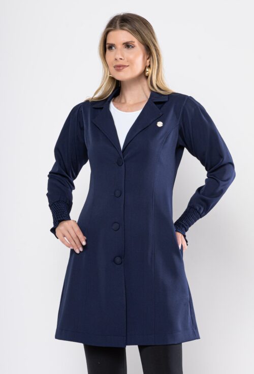 O modelo apresenta uma gola tradicional, que mantém a sobriedade e o visual clássico indispensável no ambiente profissional. O fechamento frontal com botões forrados reforça o cuidado nos acabamentos e confere um visual sofisticado e harmônico à peça, sem perder a praticidade.