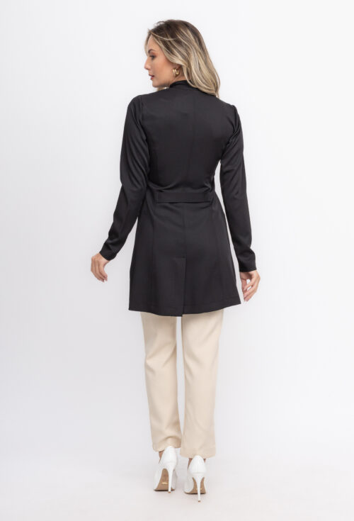 Nas costas tem um cinto no meio, dando um charme a mais no jaleco e deixando o jaleco acinturado.
