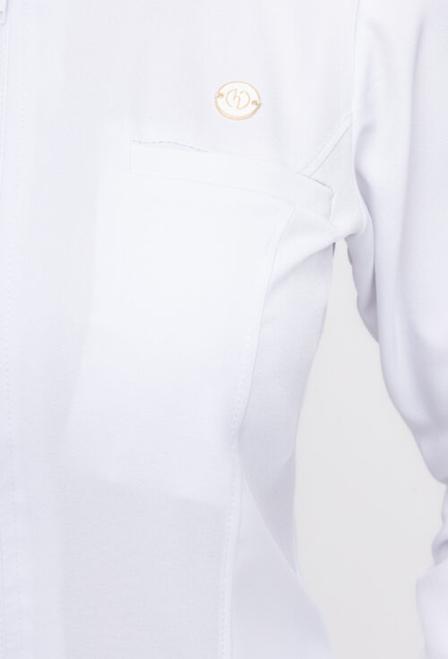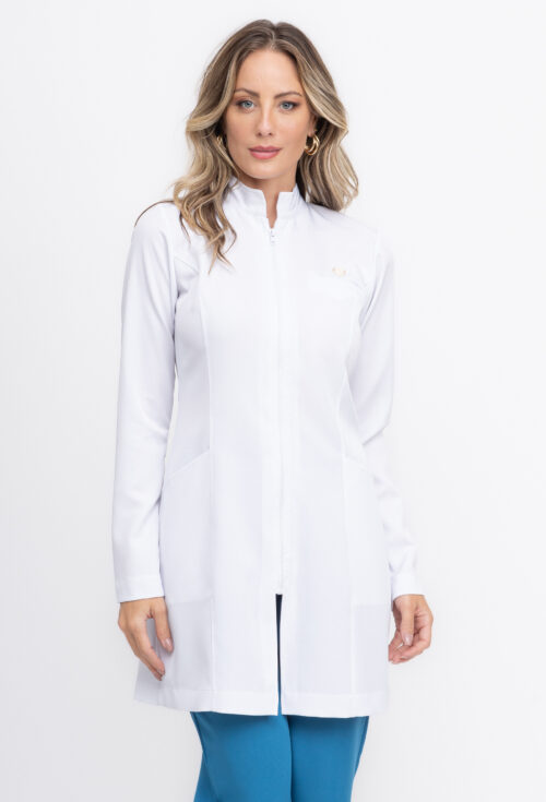 É um jaleco estiloso com o fecho inteiro em zíper na mesma cor do tecido. Bolso na parte do peito, sendo útil para objetos como caneta e muito mais. E possui também dois bolsos na parte de baixo da frente, um de cada lado.