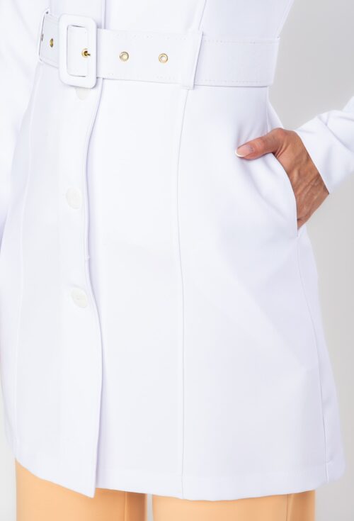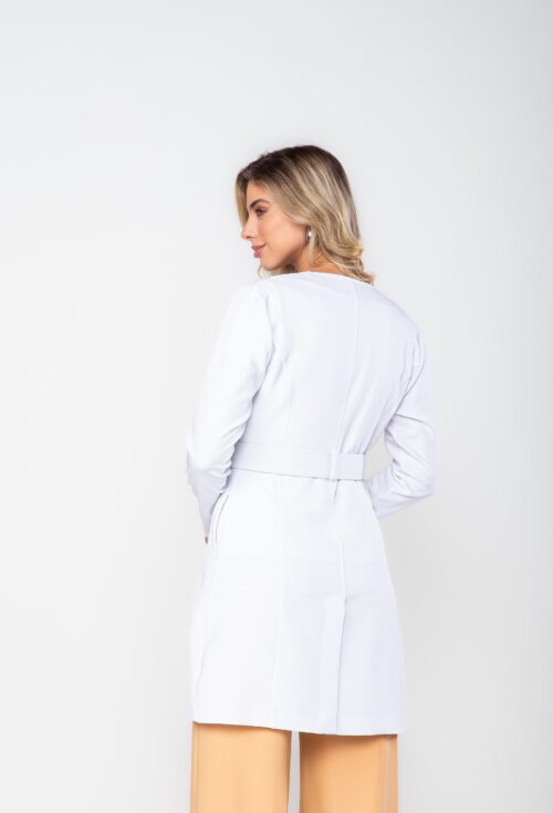O nosso modelo jaleco gola rainha com cinto foi confeccionado com tecido alfaiataria miran, que contém em sua composição 95% de poliester e 5% de elastano, assim proporcionando o conforto que você precisa para o seu dia a dia no trabalho.