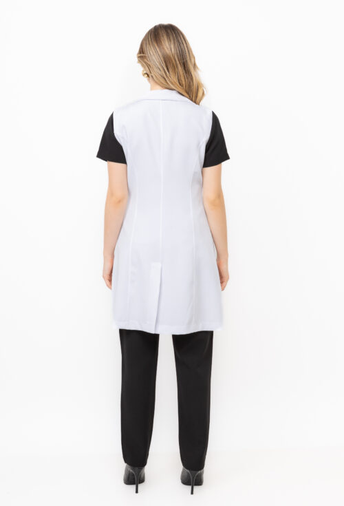 Jaleco sem manga confeccionado no tecido elastic, tendo em sua composição 95% poliéster e 5% elastano.