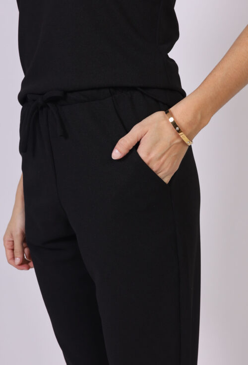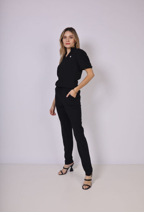 Contém um bolso de cada lado na roupa e um bolso de cada lado na calça também, assim proporcionando praticidade para o seu dia no trabalho.