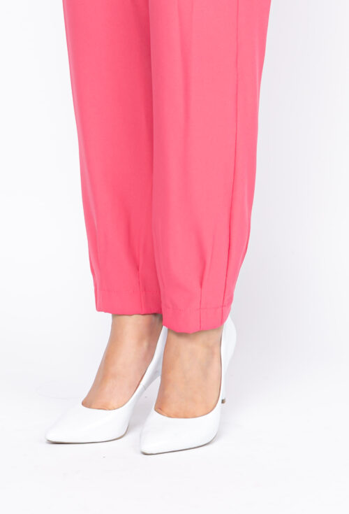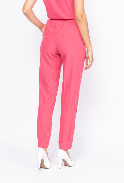 Já a calça com corte reto, elástico na cintura com cordão facilitando o ajuste na cintura com bolsos nas laterais, e a barra da calça mais ajustada com duas pregas que dá todo o charme.