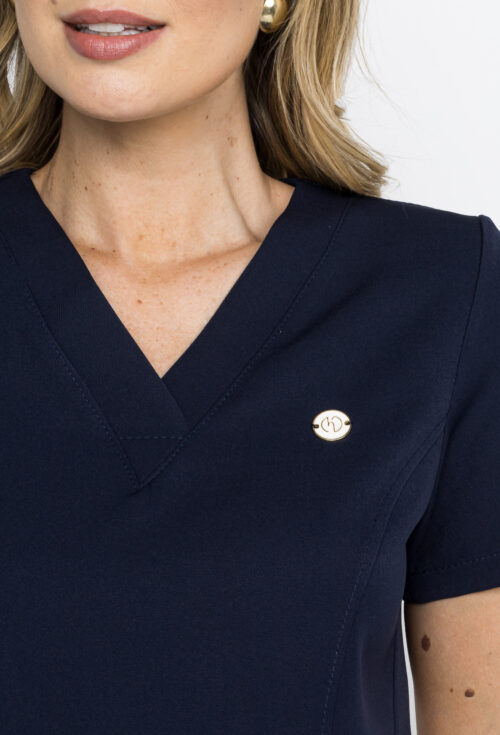 Sua blusa é um modelo bem básico, com a gola em v. Possui bolsos, e um recorte que deixa a blusa bem acinturada.