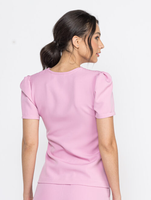 A blusa é um modelo tradicional com a gola v, e com um toque de estilo com as mangas um pouco franzidas.