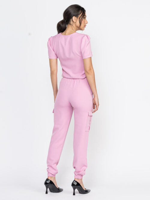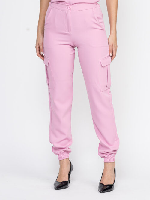 A calça possui cós com zíper na frente e elástico nas costas, deixando assim bem confortável. Nas laterais com bolsos e a barra com elástico.