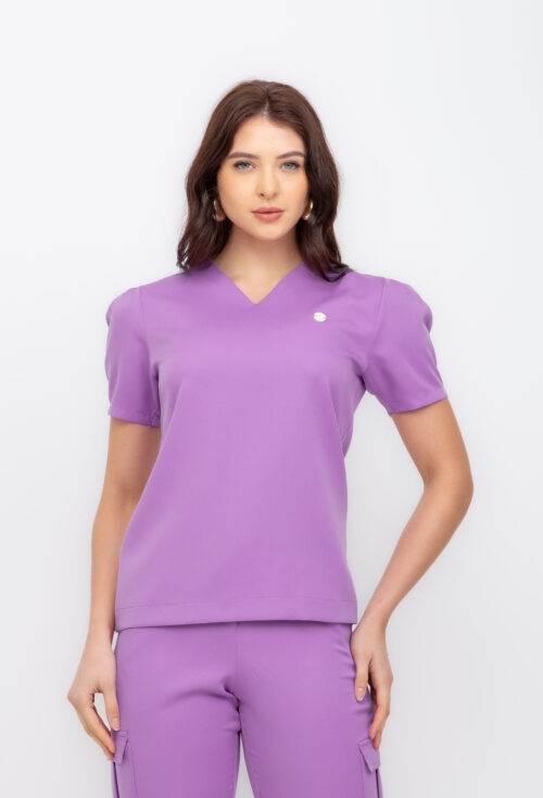 Scrub feminino barbie luxo, confeccionado no tecido barbie alfaiataria com composição de 95% poliéster e 5% elastano.