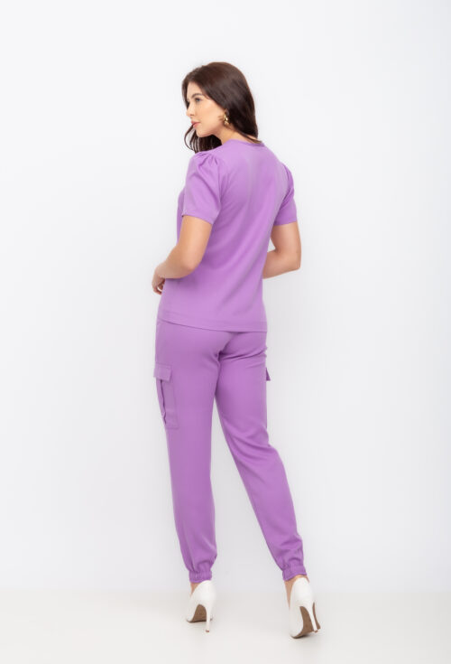 A blusa é um modelo tradicional com a gola v, e com um toque de estilo com as mangas um pouco franzidas.
