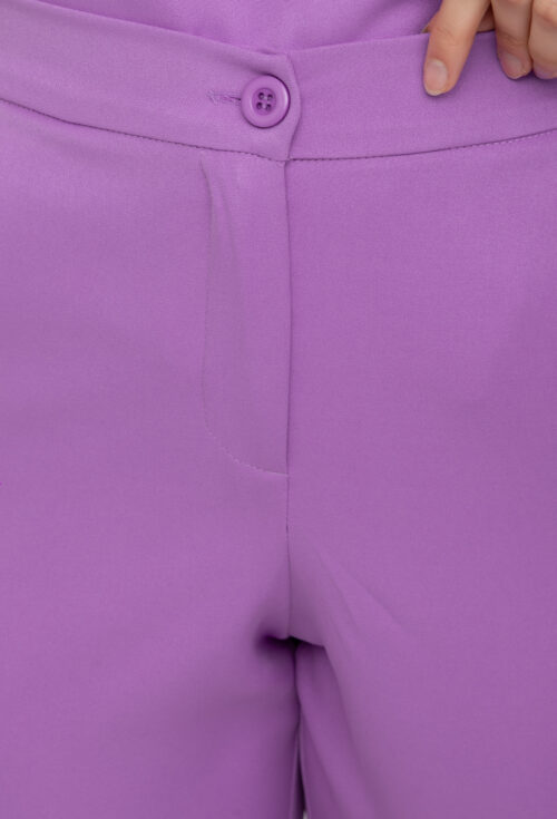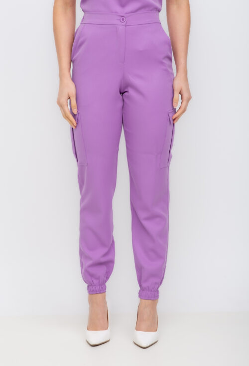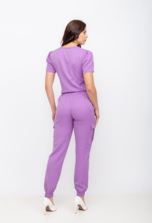 A calça possui cós com zíper na frente e elástico nas costas, deixando assim bem confortável. Nas laterais com bolsos e a barra com elástico.