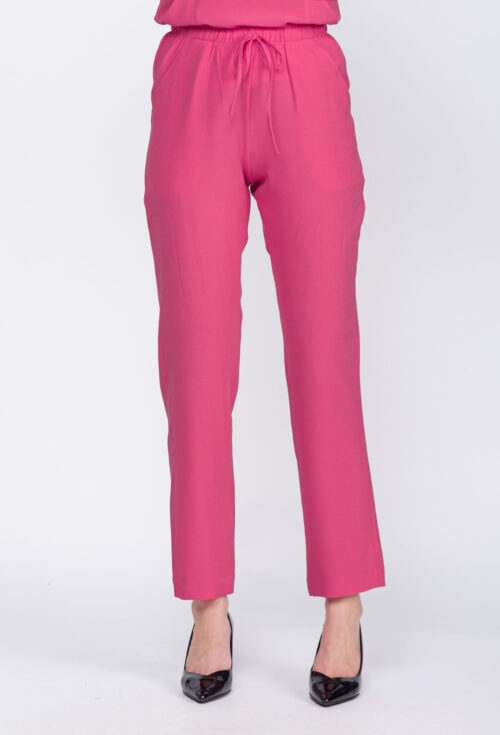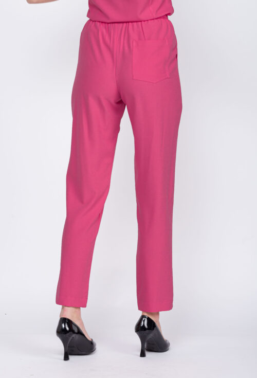 A calça corte reto , com elástico na cintura e cordão para regulagem , possui bolsos faca .