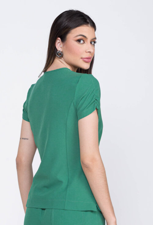A Blusa em gola V tradicional, possui bolsos com recortes acinturados , e a manga franzida dando todo o destaque .