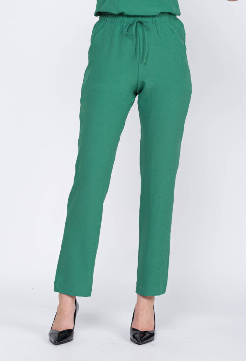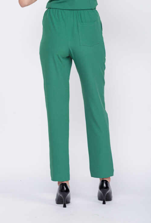 A calça corte reto , com elástico na cintura e cordão para regulagem , possui bolsos faca .