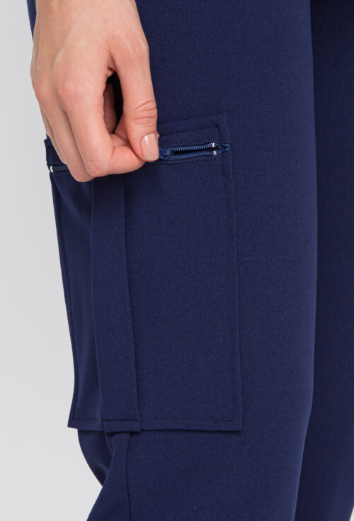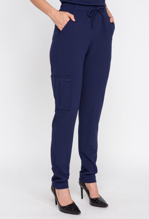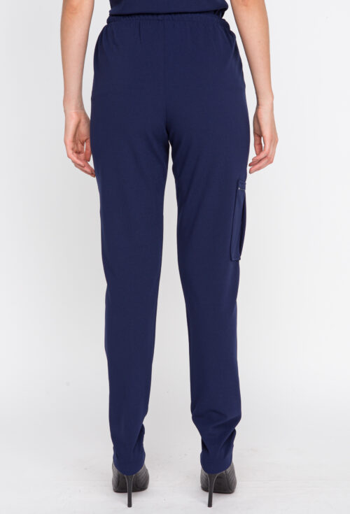 Já a calça é de elástico com cordões, possibilitando assim regular a cintura. Possui bolso sobreposto com zíper na perna e bolsos faca nas laterais.