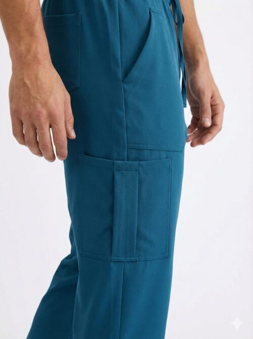 A calça, desenhada para total mobilidade, possui um cós elástico com ajuste por cadarço, assegurando que a peça permaneça no lugar com conforto durante todo o turno. A versatilidade é o seu ponto forte: além dos bolsos frontais e traseiros, ela inclui um prático bolso cargo lateral, ideal para armazenar dispositivos móveis ou equipamentos de trabalho com segurança e fácil acesso.