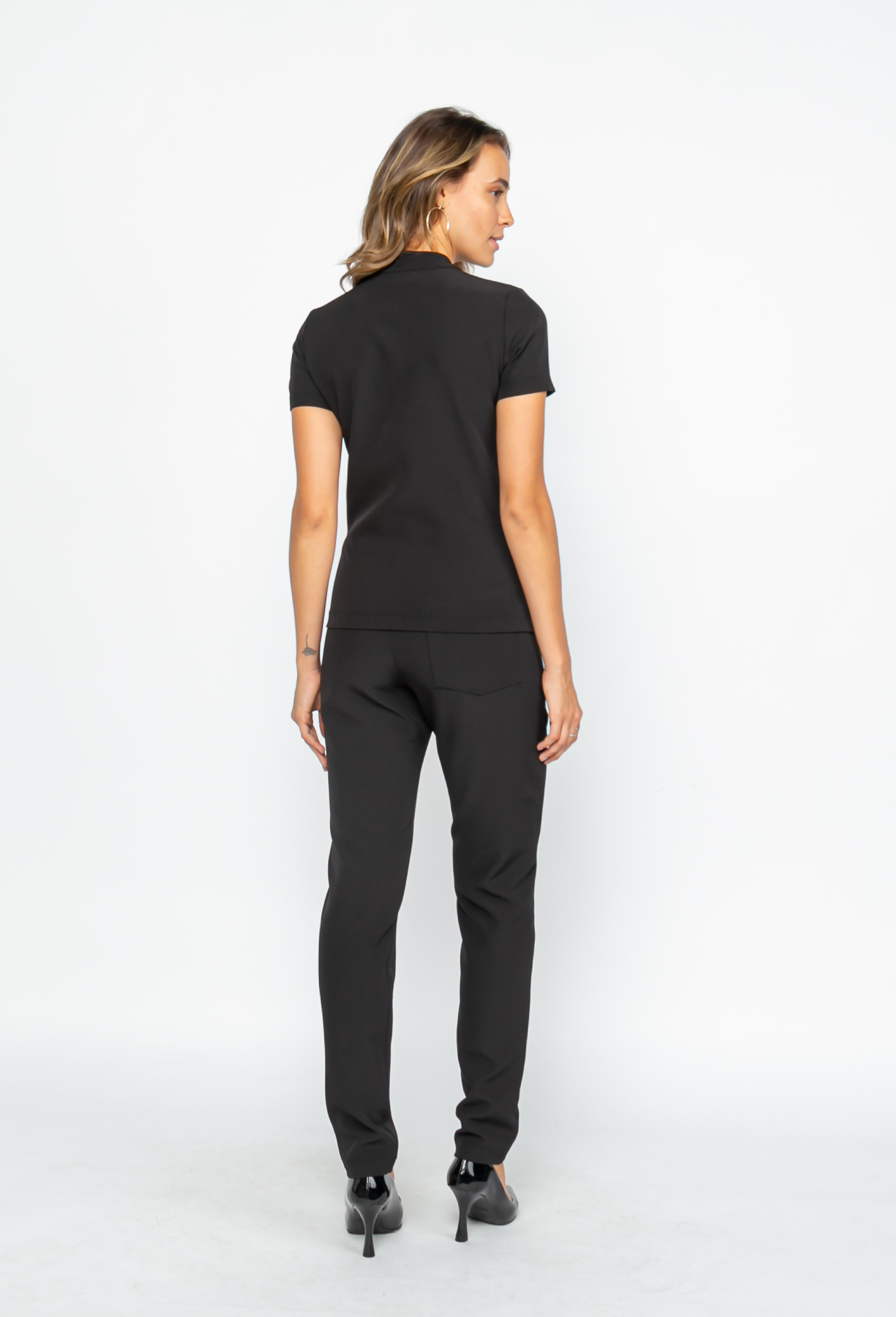 Esse modelo possui um ziper na gola da blusa, que facilita muito ao vestir e pode-se controlar o decote com a abertura do ziper. O modelo consta também com bolsos nas laterais.