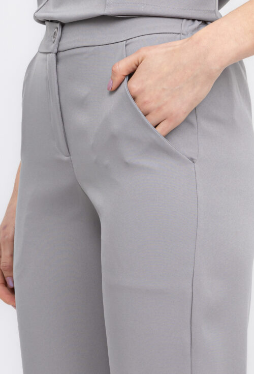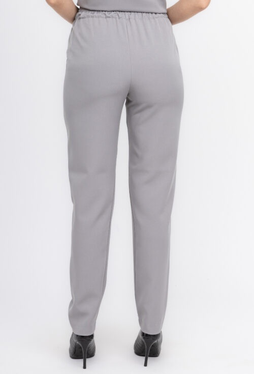 Na calça possui um bolso de cada lado, e na cintura possui cós com botão e zíper na frente. Já na parte traseira possui um elástico que possibilita regular a cintura.